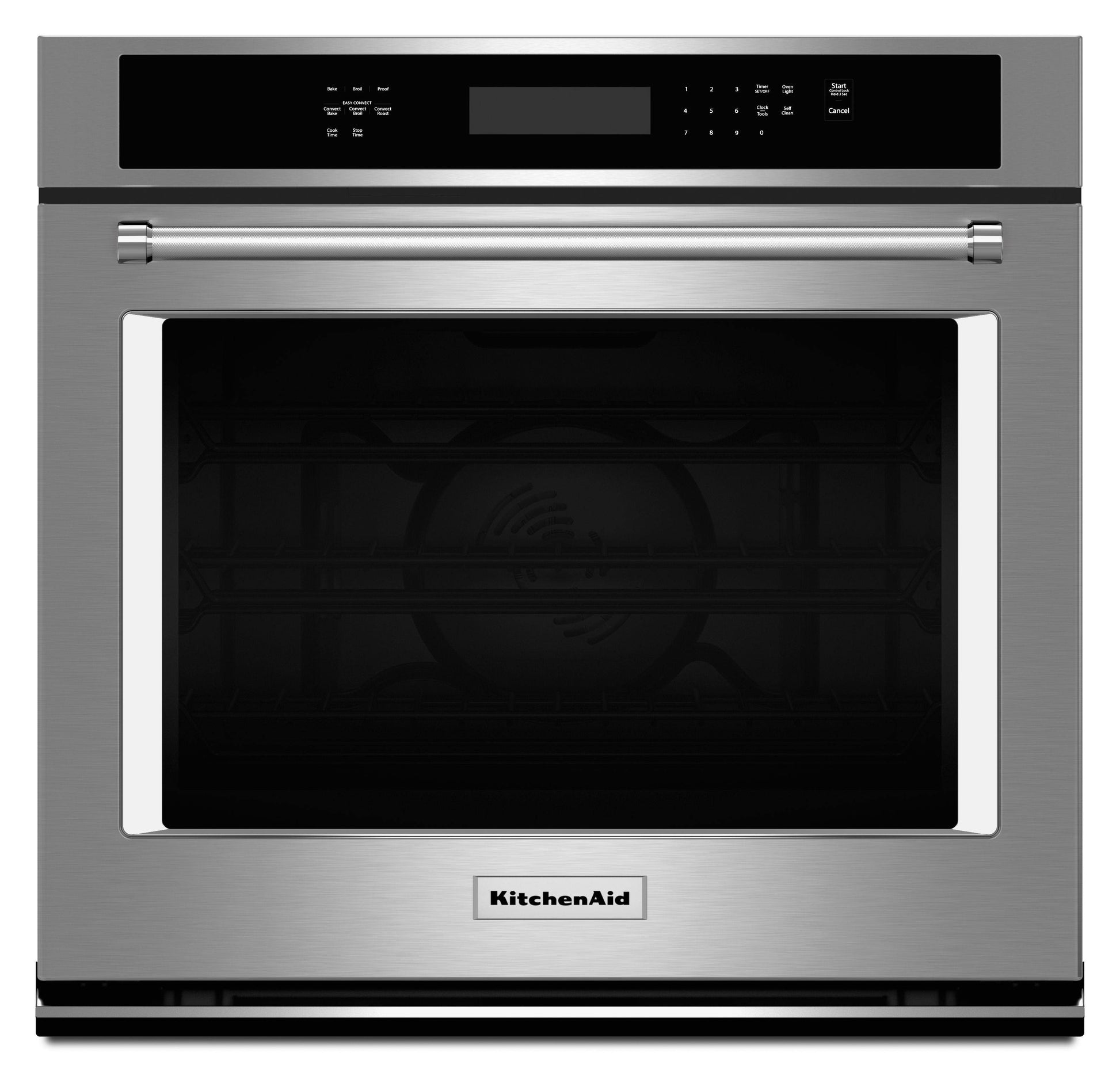 KitchenAid Single Wall Oven (KOSE500ESS) features an Even-Heat™ True Convection System for precise, consistent baking and roasting. Its 4.4 cubic foot oven holds a full-size commercial baking sheet and interior lighting ensures you can easily monitor your food. The stylish stainless-steel finish adds an elegant touch to any kitchen.